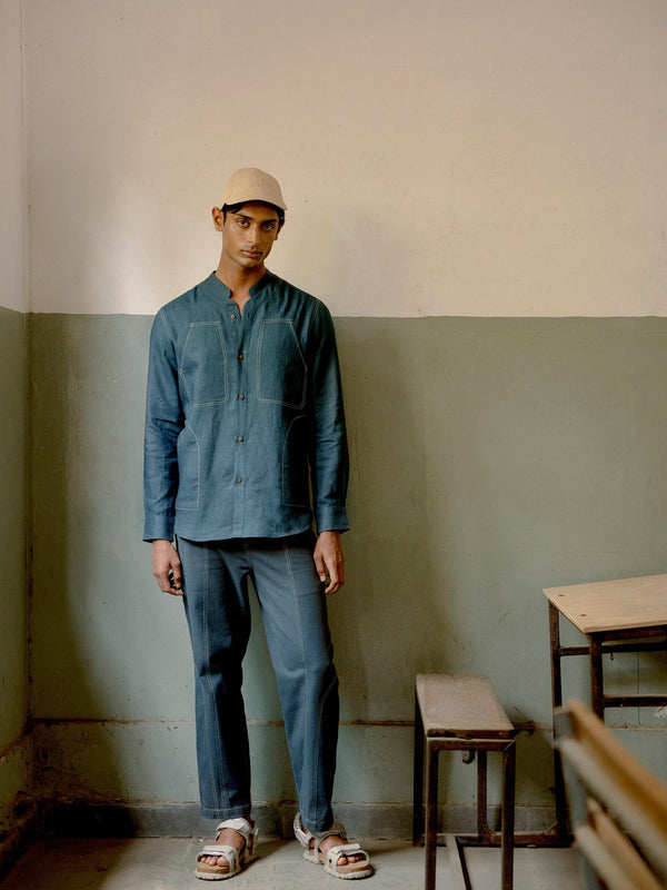 Collarless shirts come from old-fashioned work clothes and tailoring. This co-ord set has a stand collar, wooden buttons, and exquisite stitching that seems like it was made by hand.