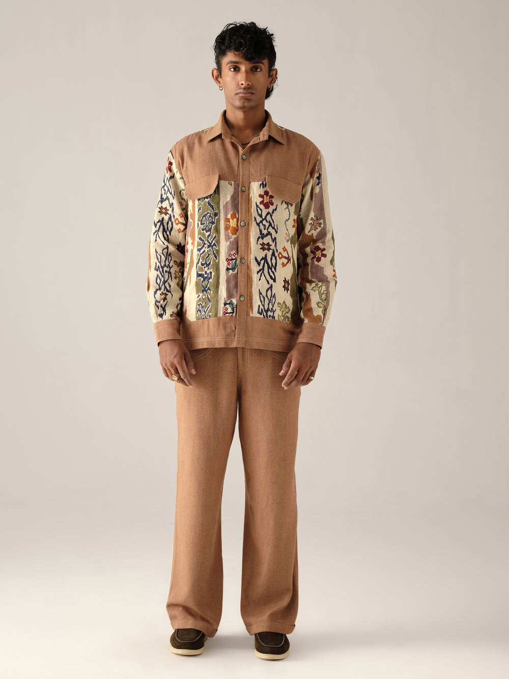 Old-fashioned work clothes frequently have strong fabrics, needlework, and loose forms. This legacy is elegantly shown with a shacket with smocked pockets and floral hand embroidery, together with vintage-style trousers.