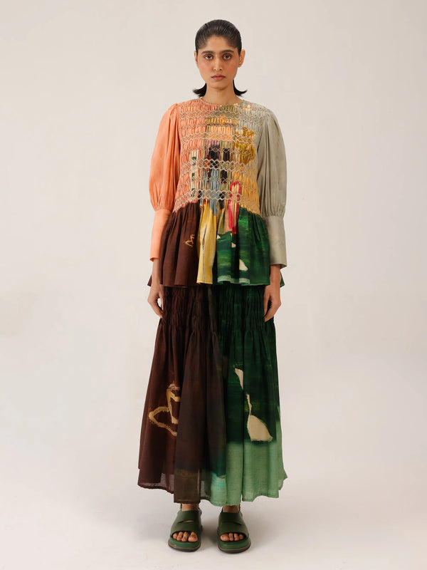 The Gaia Set is made of soft silk and has sculpted elements that make it look great. The smocked Gaia blouse with bishop sleeves looks great with the flowing July skirt. Together, they provide a classy shape that is excellent for meals or cultural events on your trip.