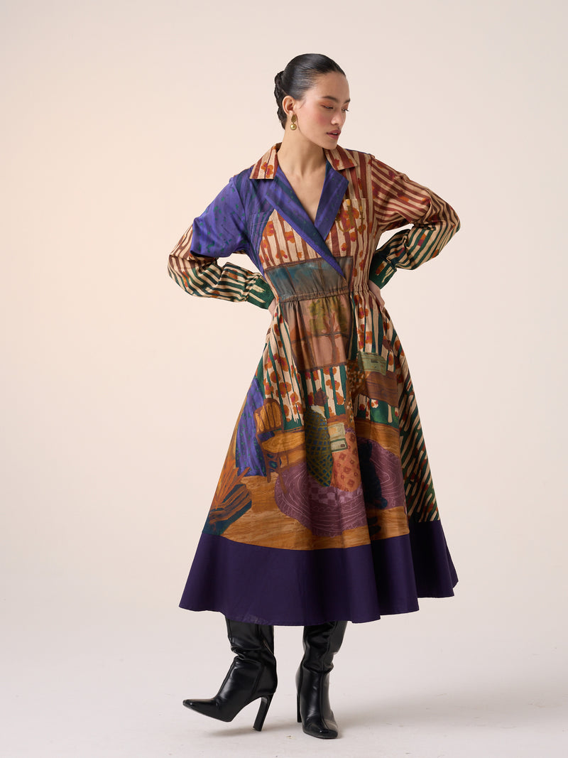 This dress features a harmonious blend of abstract prints, combining bold and subtle patterns that create a visually striking effect. The color-blocked design elements add depth and dimension, making it a standout piece in any wardrobe.