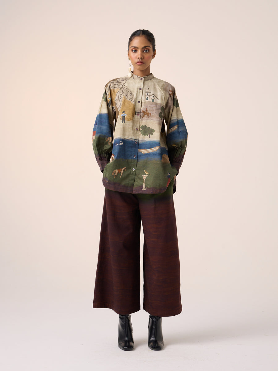 The A-Line Shirt Set is a stylish, everyday summer ensemble crafted from pure cotton in a calming village print. Its relaxed raglan sleeves and button-down front offer a laid-back elegance, while the tailored wide-leg pants add a refined touch with their graceful flare and front darts. Pair with classic loafers or minimal heels, and you’re ready to conquer your workday in style and comfort.