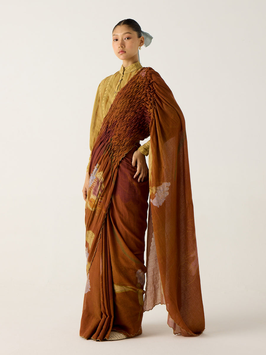 Smocked Saree in Foliage Print