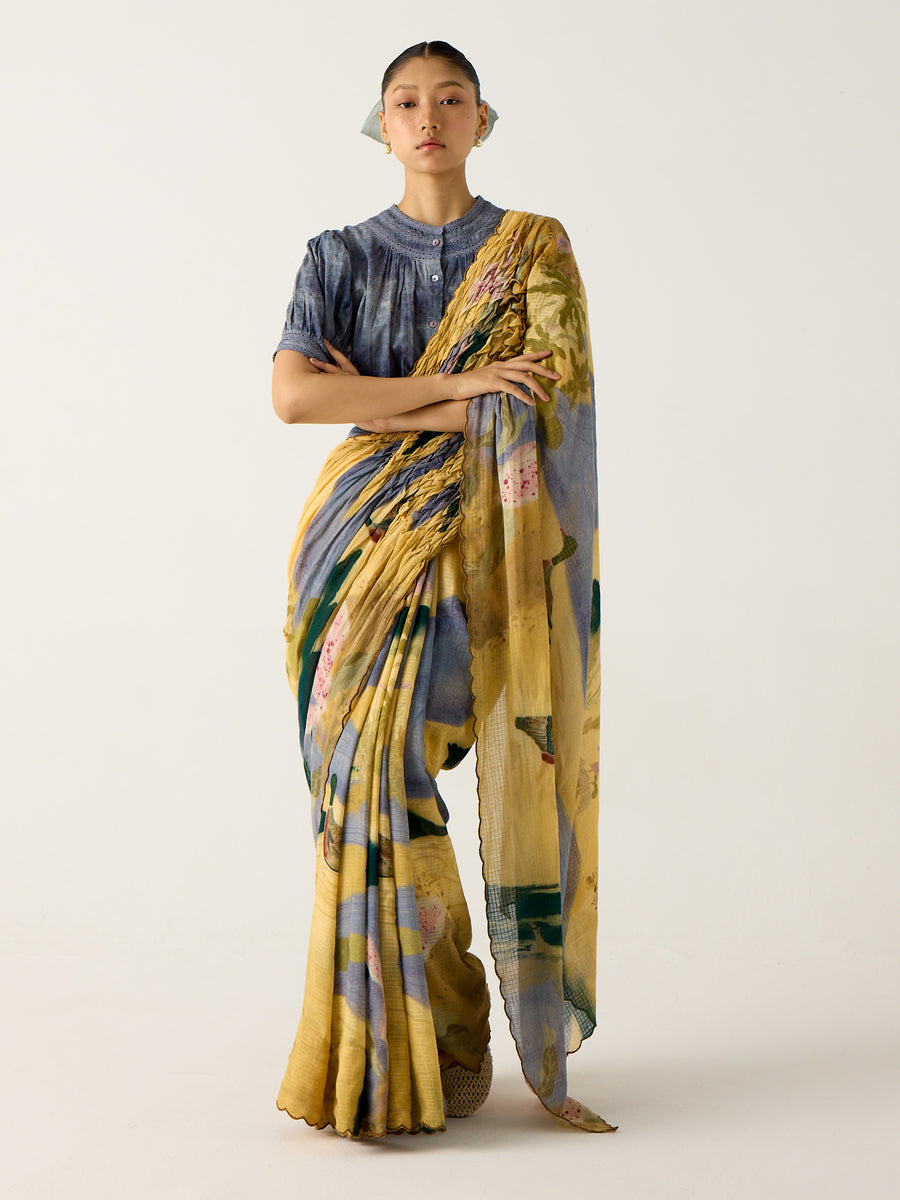 The Foliage Print Smocked Saree embodies a wonderful combination of craftsmanship and vintage-inspired styles. It is made of cotton and has lovely hand-smocking on the shoulder panel and delicate scalloped edges that showcase such fine artisanal detail. The foliage design is complemented with scale details on the sleeves for a fresh and natural feel. With a relaxed silhouette and breathable fabric, this piece is truly slow fashion while maintaining classic elegance.