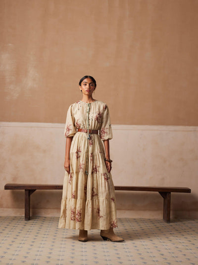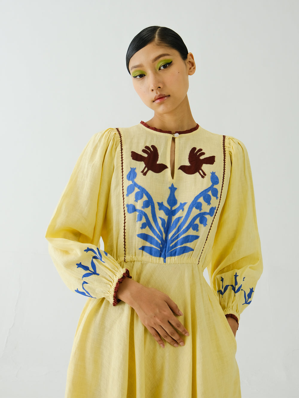 Breezy yet refined, the Emma Dress in butter yellow linen channels the timeless grace of vintage summer wear. Hand-appliquéd birds adorn the yoke, while lace-trimmed cuffs and a tiered hem add delicate charm. Subtle block prints lend depth to its flowing silhouette, creating a piece that feels artisanal and effortlessly modern — perfect for sunlit garden gatherings or evening coastal strolls.