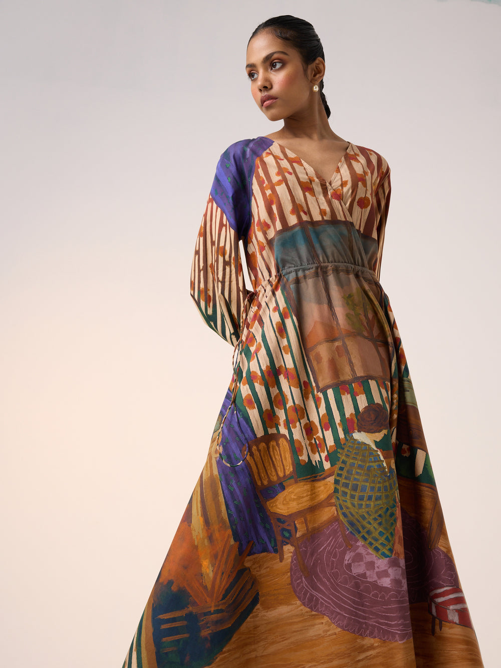 Infused with retro charm and crafted with a modern artisanal touch, this vintage-inspired dress features a vibrant all-over print offset by a bold color-blocked upper panel. A structured shoulder flap lends definition, while the adjustable drawstring waist offers versatility — cinch it for a refined silhouette or wear it loose for effortless ease. Finished with a graceful, fluid hem, it channels the free-spirited energy of the ’70s, reimagined in a timeless design that embodies comfort, style, and everyday wearability.