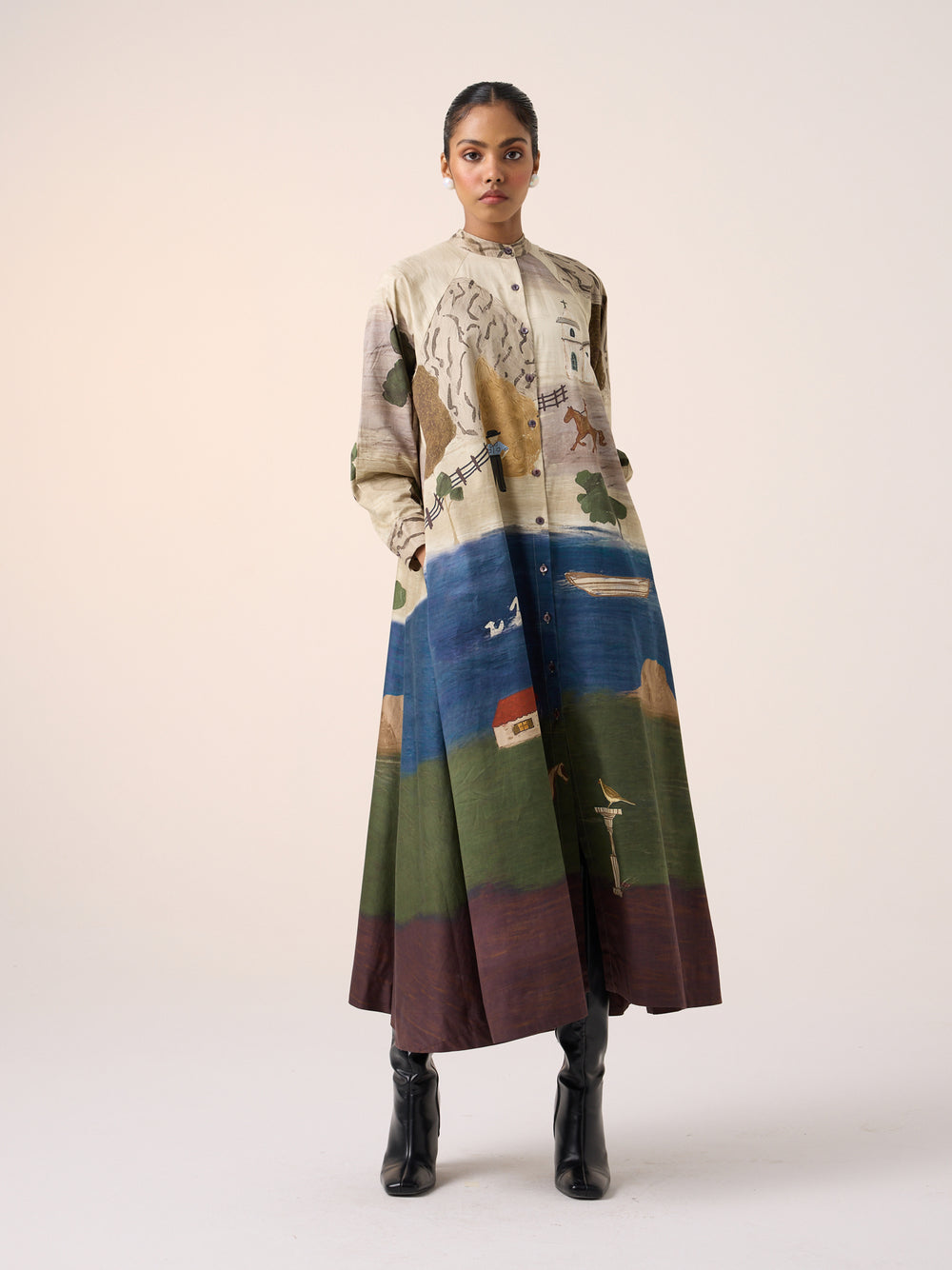 Blending timeless tailoring with a touch of vintage charm, this calf-length A-line dress draws inspiration from the classic trench coat. Designed in pure cotton with an all-over print, it features a tapered waist, oversized collars, and an in-built belt for a flattering silhouette. Effortlessly marrying structure with ease, it’s a refined statement piece for the modern wardrobe.