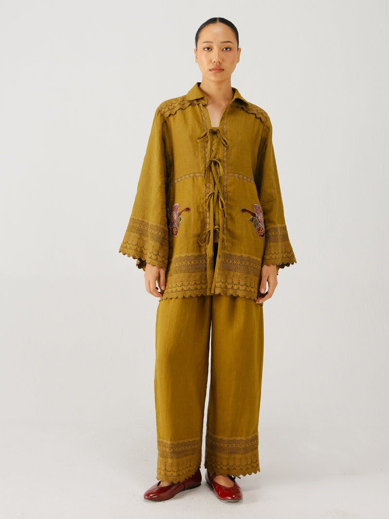 The Tie-Up Set in Olive features a straight-fit shirt with bell sleeves paired with comfortable drawstring pants. Its front tie-up design and detailed parrot hand embroidery add a playful yet elegant vintage touch. Lace accents along the cuffs and hem further enhance its classic charm. Lightweight and breathable, this set is perfect for casual outings, sightseeing, or travel days when comfort and style are both essential. With its versatile design, the Tie-Up Set effortlessly blends timeless vintage style clothing with modern practicality.